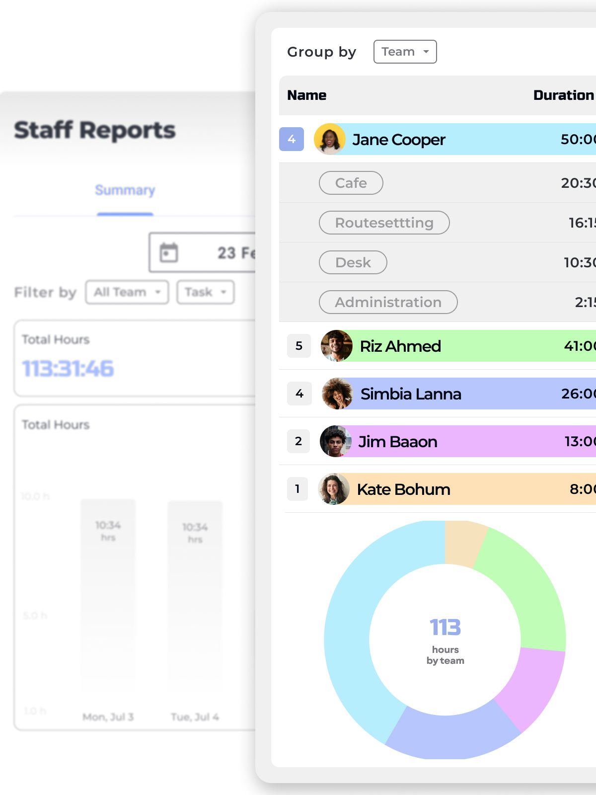 Discover exactly where time is spent, thanks to tagged roles. Whether you prefer a concise breakdown per person or a general activity log, BETA's reports adapt to your needs. Use our standard shift tags (Desk, Manager, Cafe, Events, Routesetting or create your own.